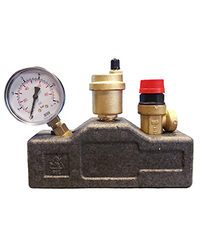 Gruppo di sicurezza e controllo per impianti di riscaldamento composto da valvola di sicurezza, valvola sfiato aria e manometro, disponibile con guscio di coibentazione.