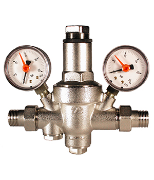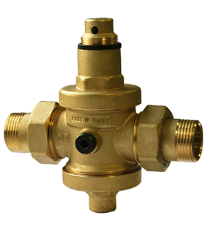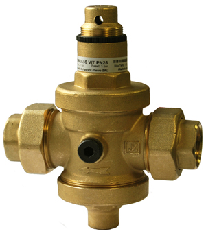 Riduttore di pressione in ottone con raccordi a bocchettone MM, gomme in FPM, funzionamento a pistone e sistema di compensazione della pressione a valle, sede in acciaio inox. Uso con acqua calda o gasolio.