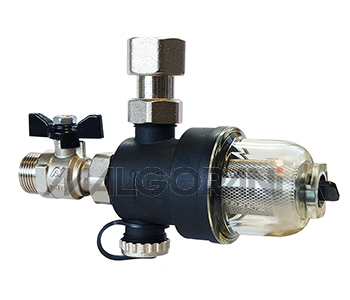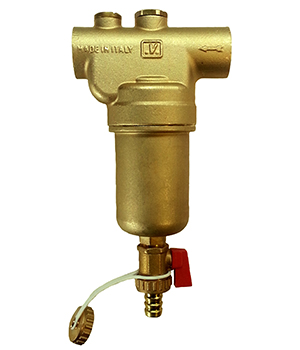 Filtro magnetico sottocaldaia compatto, vaso di decantazione trasparente, in materiale plastico ad alta resisteza, cartuccia filtrante in acciaio e cartuccia magnetica 12.000 gauss, prodotto brevettato.