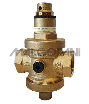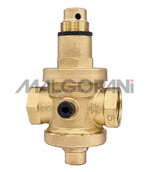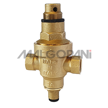 Riduttore di pressione in ottone filettato FF, con funzionamento a pistone e sistema della compensazione della pressione a valle, sede in acciaio inox, gomme in FPM per uso con acqua calda o gasolio.