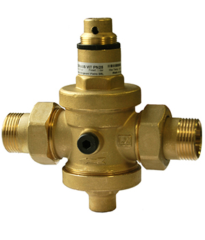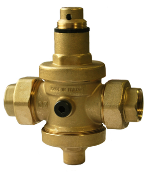 Riduttore di pressione in ottone con raccordi a bocchettone MM, gomme in FPM, funzionamento a pistone e sistema di compensazione della pressione a valle, sede in acciaio inox. Uso con acqua calda o gasolio.