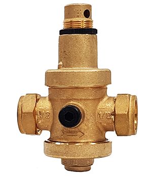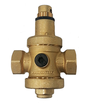 Riduttore di pressione in ottone con raccordi a bocchettone MM, funzionamento a pistone e sistema di compensazione della pressione a valle, sede in acciaio inox.
