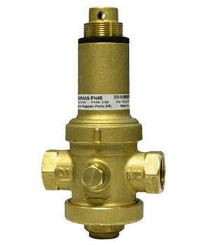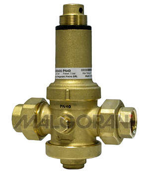 Riduttore di pressione in ottone con attacchi a bocchettone FF, funzionamento a pistone, sistema di compensazione della pressione a valle, sistema brevettato DSB e DSP.