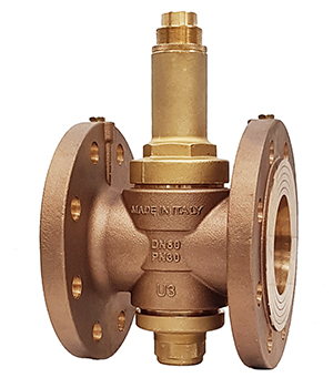 Riduttore di pressione con attacchi flangiati, corpo in bronzo e componenti in ottone, sede e asta in acciaio inox, sistema di compensazione della pressione a valle.